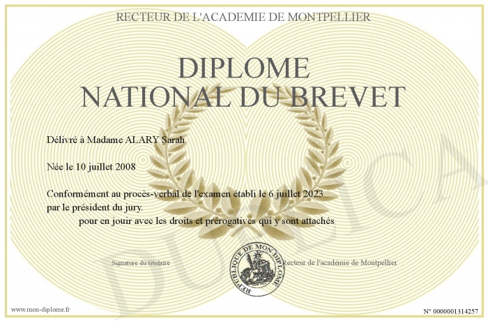 Envoyez par email votre Diplôme national du brevet personalisé