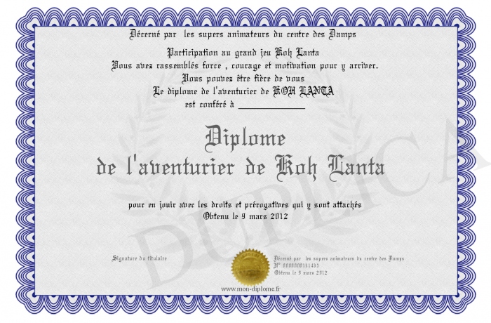 Envoyez par email votre Diplôme de l'aventurier de Koh Lanta personalisé