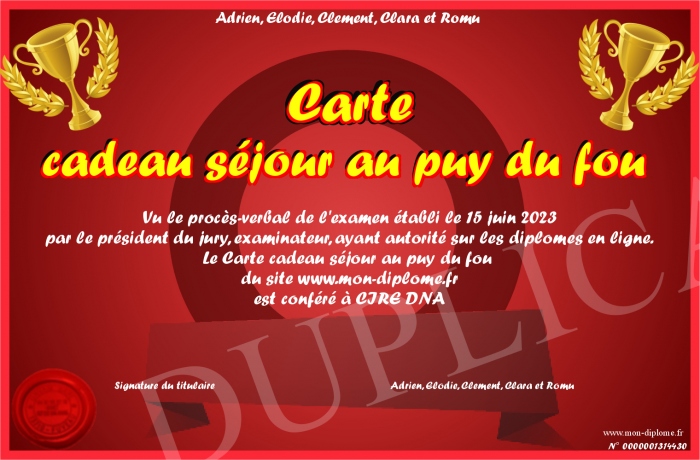 Envoyez par email votre Carte cadeau séjour au puy du fou personalisé