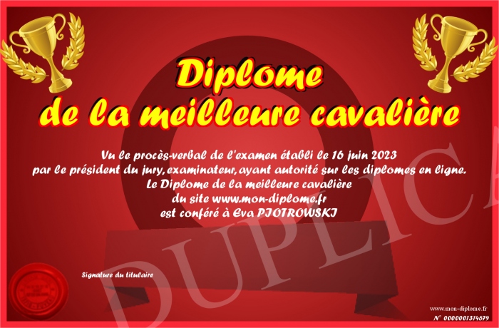 Envoyez par email votre Diplôme de la meilleure cavalière personalisé