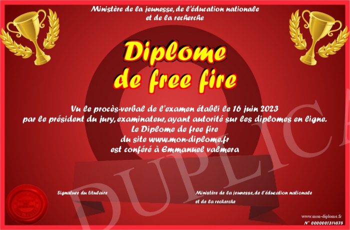 Envoyez par email votre Diplôme de free fire personalisé