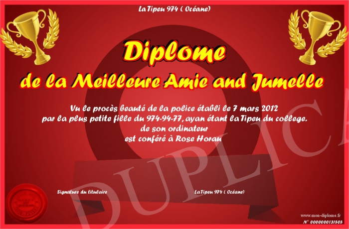 Envoyez par email votre Diplome de la Meilleure Amie and Jumelle personalisé