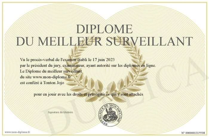 Envoyez par email votre Diplôme du meilleur surveillant personalisé