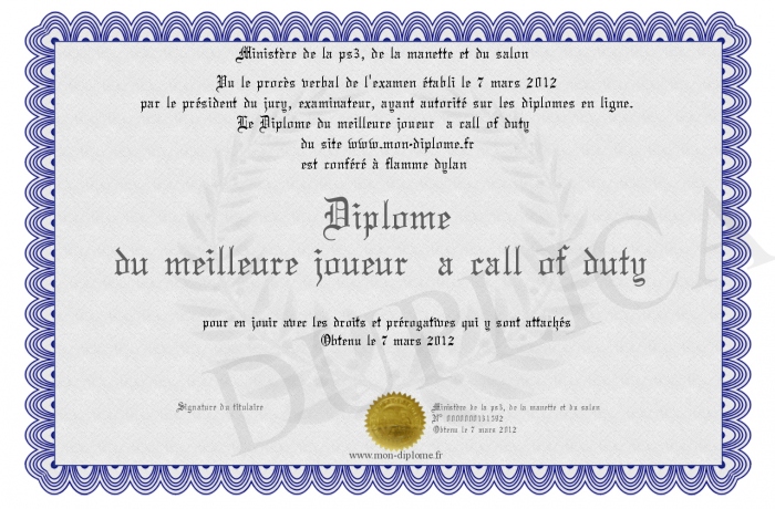 Envoyez par email votre Diplome du meilleure joueur a call of duty personalisé