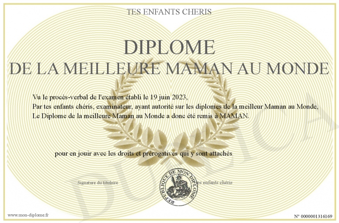 Envoyez par email votre Diplôme de la meilleure Maman au Monde personalisé