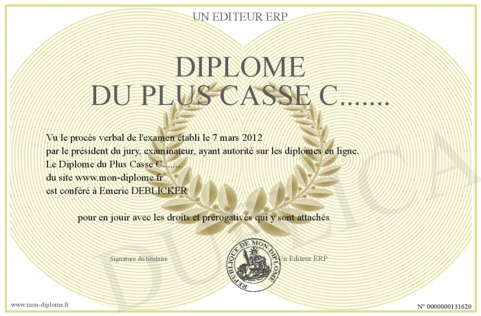 Envoyez par email votre Diplôme du Plus Casse C....... personalisé