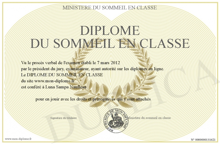 Envoyez par email votre DIPLOME DU SOMMEIL EN CLASSE personalisé