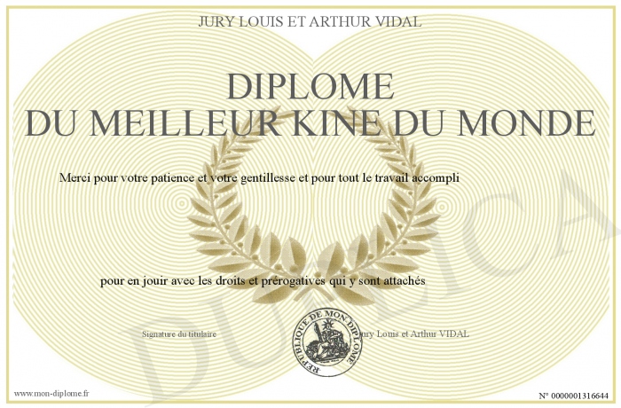 Envoyez par email votre Diplôme du meilleur kiné du monde personalisé