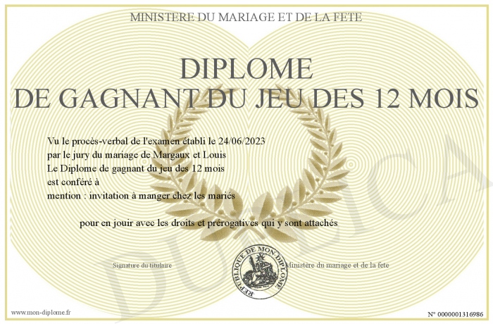 Envoyez par email votre Diplôme de gagnant du jeu des 12 mois personalisé
