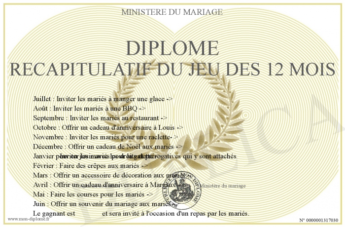 Envoyez par email votre Diplôme récapitulatif du jeu des 12 mois personalisé