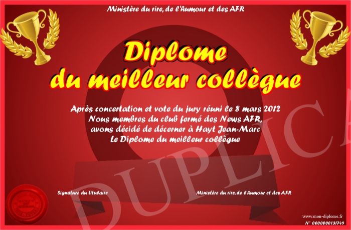 Envoyez par email votre Diplome du meilleur collègue personalisé