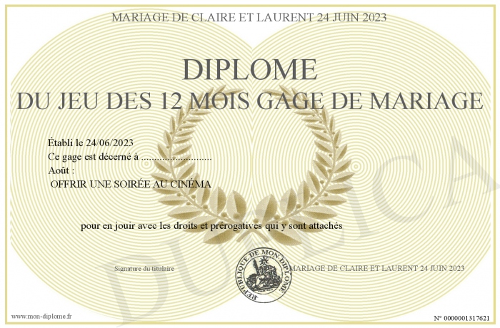 Envoyez par email votre Diplôme du jeu des 12 MOIS GAGE DE MARIAGE personalisé