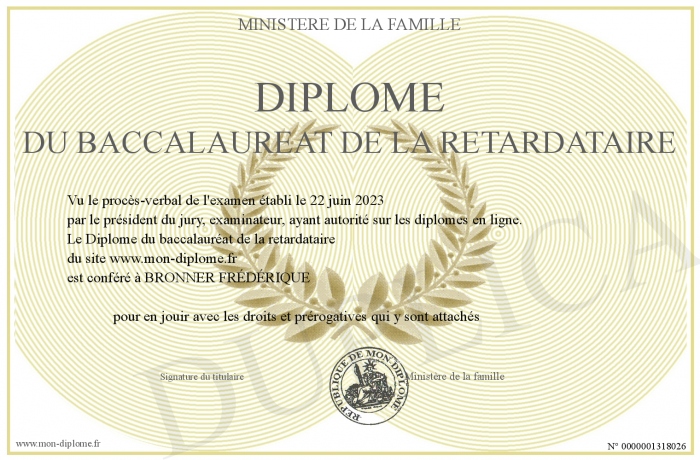 Envoyez par email votre Diplôme du baccalauréat de la retardataire personalisé
