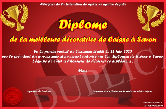 Envoyez par email votre Diplôme de la meilleure décoratrice de Caisse à Savon personalisé