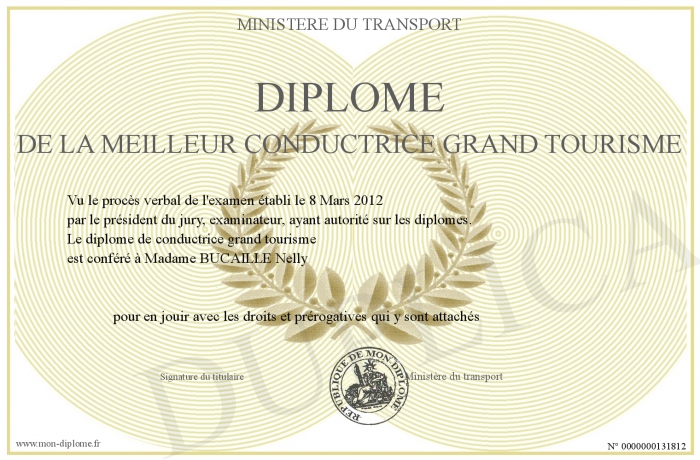 Envoyez par email votre Diplôme de la meilleur conductrice grand tourisme personalisé