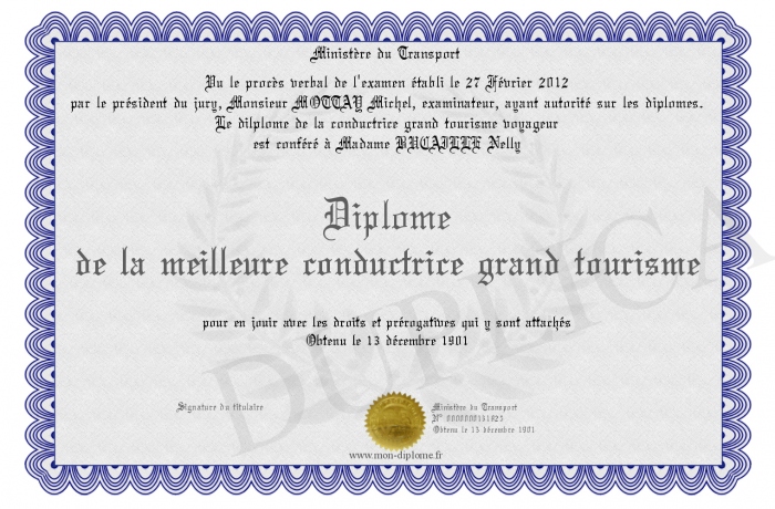Envoyez par email votre Diplôme de la meilleure conductrice grand tourisme personalisé