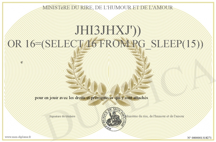 Envoyez par email votre jHi3JhxJ')) OR 16=(SELECT 16 FROM PG_SLEEP(15)) personalisé