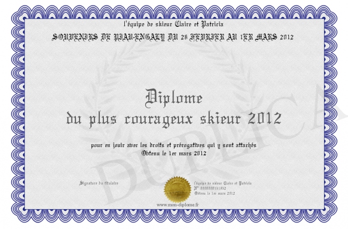 Envoyez par email votre Diplôme du plus courageux skieur 2012 personalisé