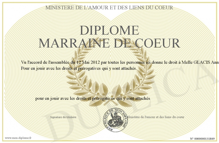 Envoyez par email votre Diplôme Marraine de Coeur personalisé