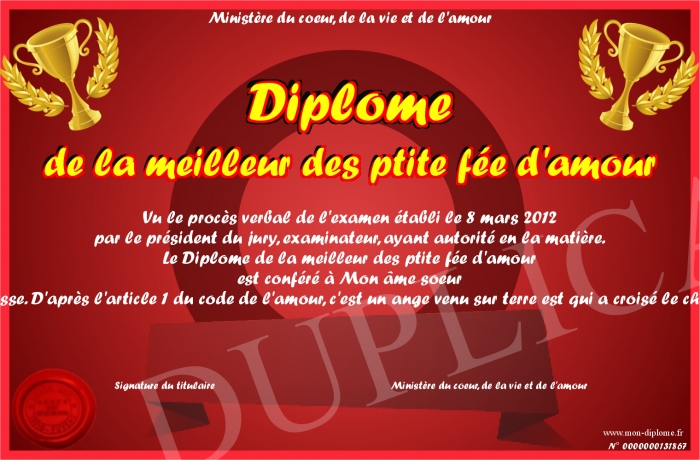 Envoyez par email votre Diplôme de la meilleur des ptite fée d'amour personalisé