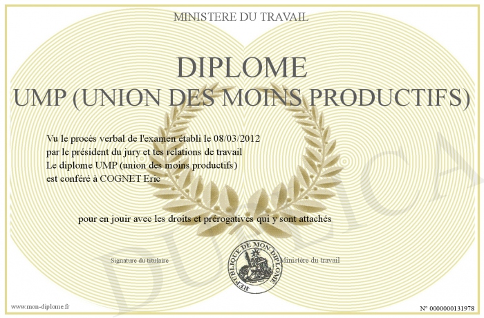 Envoyez par email votre Diplôme UMP (union des moins productifs) personalisé