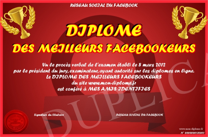 Envoyez par email votre DIPLOME DES MEILLEURS FACEBOOKEURS personalisé