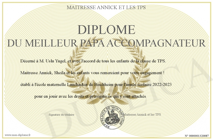 Envoyez par email votre Diplôme du meilleur papa accompagnateur personalisé