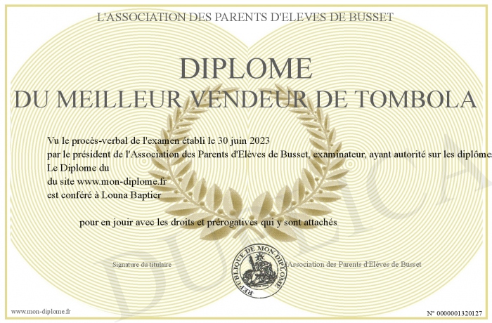 Envoyez par email votre Diplôme du meilleur vendeur de Tombola personalisé