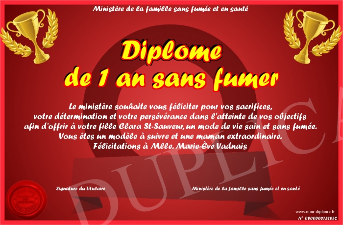 Envoyez par email votre Diplome de 1 an sans fumer personalisé
