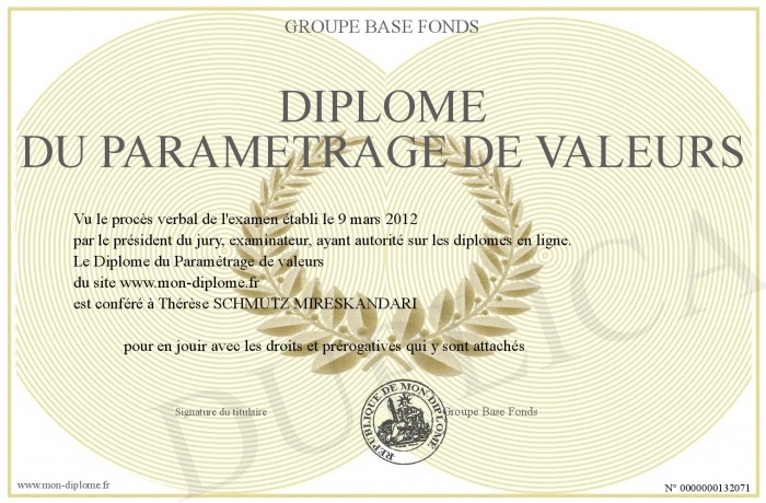Envoyez par email votre Diplôme du Paramétrage de valeurs personalisé