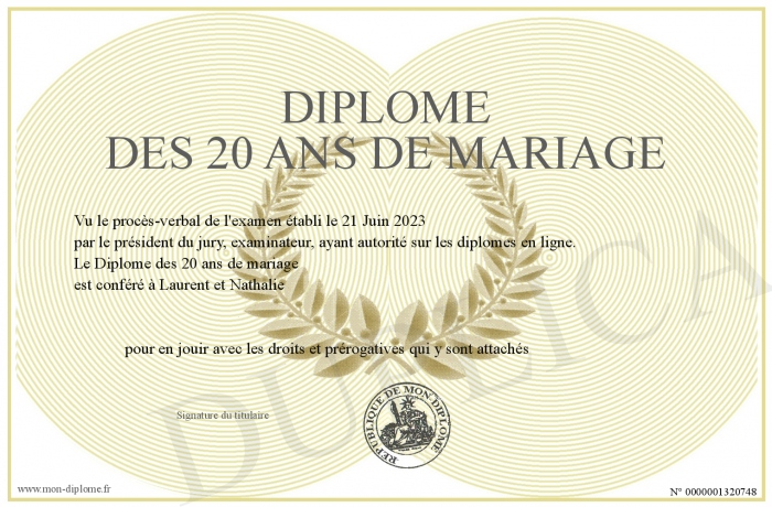 Envoyez par email votre Diplôme des 20 ans de mariage personalisé
