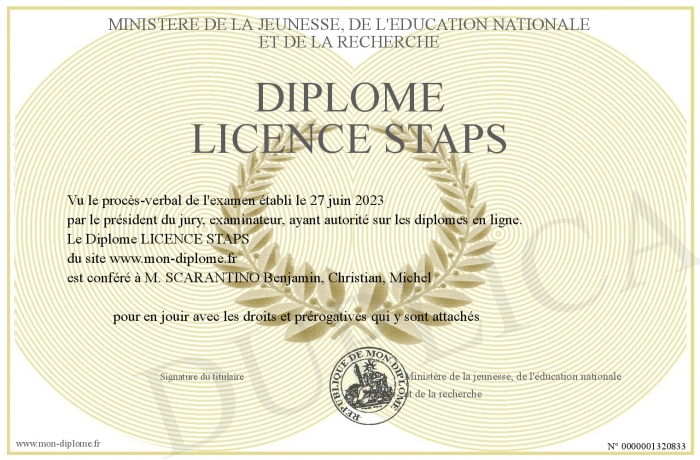 Envoyez par email votre Diplôme LICENCE STAPS personalisé