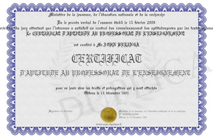 Envoyez par email votre CERTIFICAT D'APTITUDE AU PROFESSORAT DE L'ENSEIGNEMENT personalisé