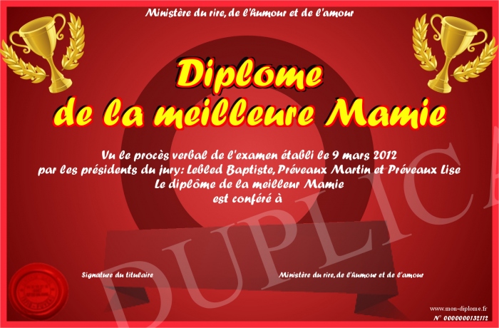 Envoyez par email votre Diplome de la meilleure Mamie personalisé