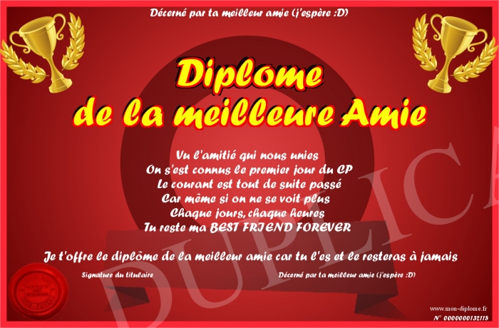 Envoyez par email votre Diplôme de la meilleure Amie personalisé