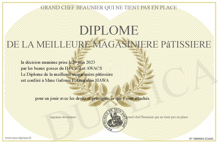 Envoyez par email votre Diplôme de la meilleure magasinière pâtissière personalisé