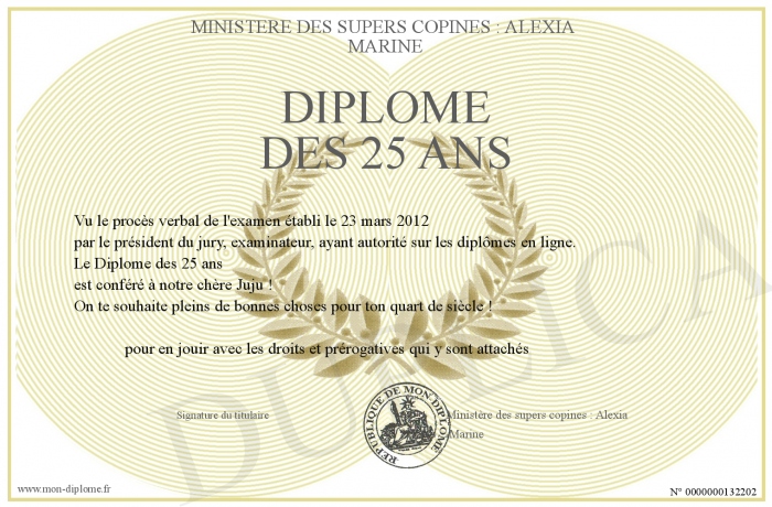 Envoyez par email votre Diplôme des 25 ans personalisé