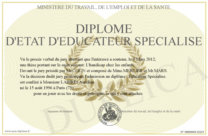 Envoyez par email votre Diplome d'etat d'educateur specialisé personalisé