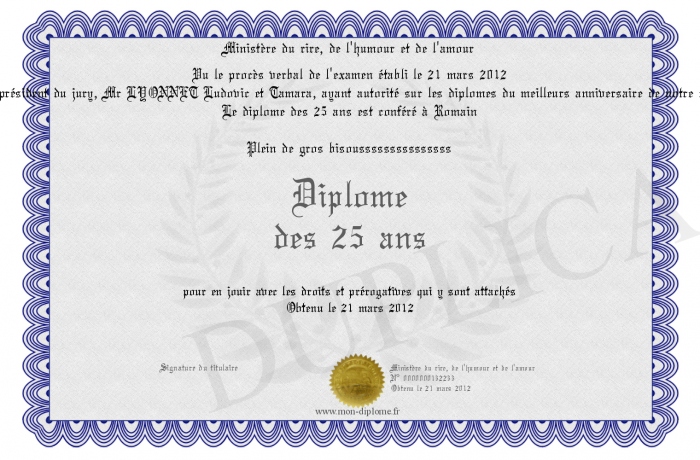 Envoyez par email votre Diplome des 25 ans personalisé