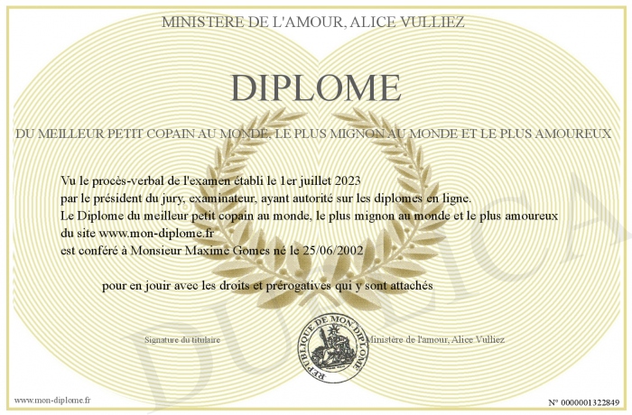 Envoyez par email votre Diplôme du meilleur petit copain au monde, le plus mignon au monde et le plus amoureux personalisé