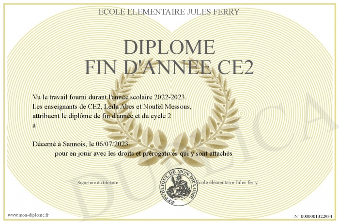 Envoyez par email votre Diplôme fin d'année ce2 personalisé