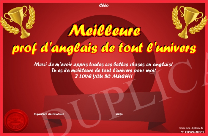 Envoyez par email votre Meilleure prof d'anglais de tout l'univers personalisé