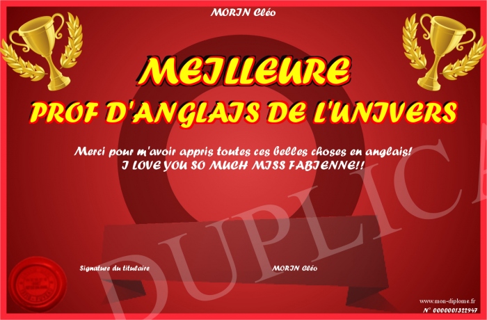 Envoyez par email votre MEILLEURE PROF D'ANGLAIS DE L'UNIVERS personalisé