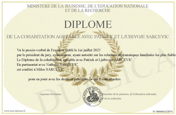 Envoyez par email votre Diplôme de la cohabitation agréable avec Patrick et Ljubivoje SARCEVIC personalisé