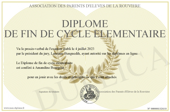 Envoyez par email votre Diplôme de fin de cycle élémentaire personalisé
