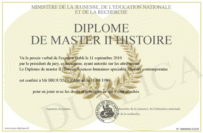 Envoyez par email votre Diplome de master II Histoire personalisé