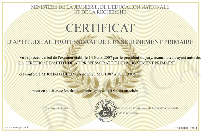 Envoyez par email votre CERTIFICAT D'APTITUDE AU PROFESSORAT DE L'ENSEUGNEMENT PRIMAIRE personalisé