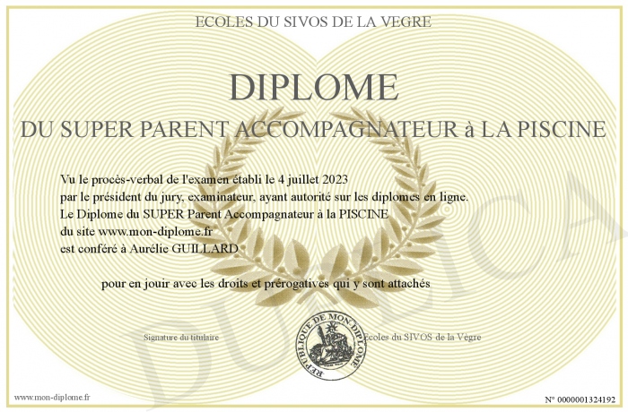 Envoyez par email votre Diplôme du SUPER Parent Accompagnateur à la PISCINE personalisé