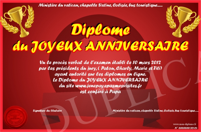 Envoyez par email votre Diplôme du JOYEUX ANNIVERSAIRE personalisé