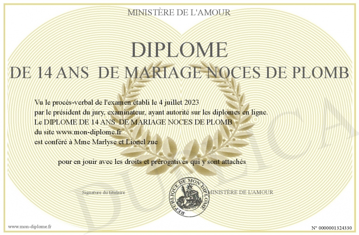 Envoyez par email votre DIPLOME DE 14 ANS DE MARIAGE NOCES DE PLOMB personalisé